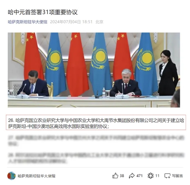 此外,两国元首的见证下,双方代表团签????? ???????????????????? ???????????????????? ???????????????????? ???????????????署了31项重要协议。其中,第26项为????? ???????????????????? ???????????????????? ???????????????????? ???????????????哈萨克国立农业研究大学与中国农业大????? ???????????????????? ???????????????????? ???????????????????? ???????????????学和大禹节水集团股份有限公司之间关????? ???????????????????? ???????????????????? ???????????????????? ???????????????于建立哈萨克斯坦-中国沙????? ??????????????????? ???????????????????? ???????????????????? ???????????????漠地区高效用水国际实验室的协议。