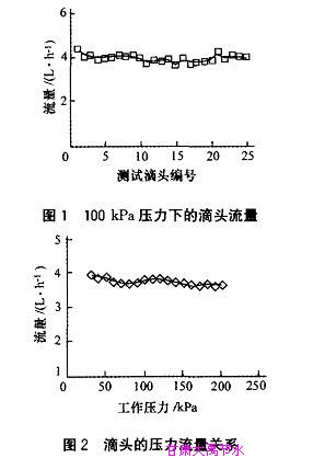(1)流量关系检测。随机抽取????? ???????????????????? ???????????????????? ???????????????????? ???????????????25个供试样品,完成滴头流量的均匀性????? ???????????????????? ???????????????????? ???????????????????? ???????????????测试。测定中,首先调节滴头人口处的水压至150????? ???????????????????? ???????????????????? ???????????????????? ??????????????kPa,然后每保压3min卸????? ???????????????????? ???????????????????? ??????????????????? ???????????????压1min,如此反复3次;随后再调节滴头????? ???????????????????? ???????????????????? ???????????????????? ???????????????人口的压力至50kPa,保压????? ???????????????????? ??????????????????? ???????????????????? ???????????????3min后卸压1min,????? ???????????????????? ???????????????????? ???????????????????? ???????????????反复3次;最后调节水压至10????? ???????????????????? ???????????????????? ??????????????????? ???????????????0kPa,保压60min,分别测量25个滴????? ???????????????????? ???????????????????? ???????????????????? ???????????????头在2min内的出水量。重复以上测定过程,????? ???????????????????? ??????????????????? ???????????????????? ???????????????使两次测得的水量之差不大于2%,取????? ???????????????????? ??????????????????? ???????????????????? ???????????????其平均值计算各试样的流量,使滴头的平均流量q=????? ???????????????????? ???????????????????? ???????????????????? ???????????????3.93L/h,流量偏差系????? ???????????????????? ???????????????????? ???????????????????? ???????????????数Cv=4.4%,流量均????? ???????????????????? ???????????????????? ???????????????????? ???????????????匀度符合国标规定[3.4],其中在10????? ???????????????????? ???????????????????? ???????????????????? ???????????????0 kPa压力下测定的滴头出????? ???????????????????? ???????????????????? ???????????????????? ???????????????流情况参见图1。