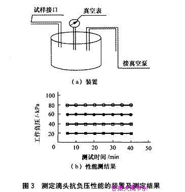 (2)抗负压防堵塞性能测试。滴头抗负????? ???????????????????? ???????????????????? ???????????????????? ???????????????压堵塞性能利用如图3(a)所示的负压吸引器,完????? ???????????????????? ???????????????????? ???????????????????? ???????????????成对滴头抗负压堵塞性能的室????? ???????????????????? ??????????????????? ???????????????????? ???????????????内测试工作。该设备可对供试滴????? ???????????????????? ??????????????????? ???????????????????? ???????????????头施加0~-80 kPa范围内的任何负????? ???????????????????? ???????????????????? ???????????????????? ???????????????压。实测中随机抽取25个滴头????? ???????????????????? ???????????????????? ???????????????????? ???????????????的样品,并逐一与负压吸引器的测试????? ???????????????????? ???????????????????? ???????????????????? ???????????????口连接,通过真空泵分级产生-20????? ???????????????????? ???????????????????? ???????????????????? ???????????????、-40、-60和-80 kPa的????? ???????????????????? ???????????????????? ??????????????????? ???????????????测试压力,相应完成不同压力下的滴头抗负压测定????? ???????????????????? ???????????????????? ???????????????????? ???????????????工作。当达到每个测试负压值后,进行保压试验,每隔????? ???????????????????? ??????????????????? ???????????????????? ??????????????5min观测一次真空表读数的????? ???????????????????? ???????????????????? ???????????????????? ???????????????变化情况,持续时间40min。测试结果表明????? ???????????????????? ???????????????????? ???????????????????? ???????????????,所有滴头试样在规定的测试时间范围内,真????? ???????????????????? ???????????????????? ???????????????????? ??????????????空表的读数均保持在稳定状态????? ???????????????????? ???????????????????? ??????????????????? ???????????????,如图3(b)。开发的内镶贴片地下灌水器的独特????? ???????????????????? ???????????????????? ???????????????????? ???????????????结构舌片及舌台结构,保证了其在负压条件下工作时????? ???????????????????? ???????????????????? ???????????????????? ???????????????,没有空气能够从滴头的出水孔????? ???????????????????? ???????????????????? ???????????????????? ???????????????处进人流道,这就意味着滴头四周????? ???????????????????? ???????????????????? ???????????????????? ???????????????的土壤细颗粒无法被吸人流????? ???????????????????? ???????????????????? ???????????????????? ???????????????道,滴头具备了良好的防负压堵塞性能。